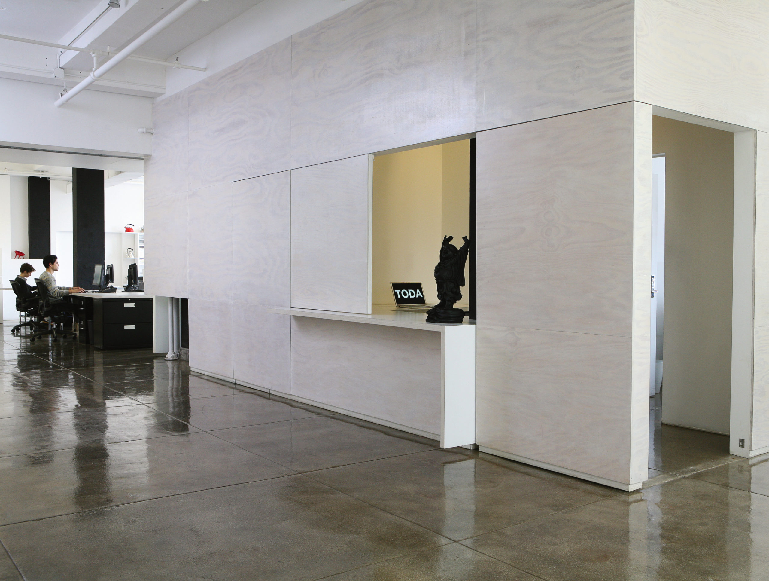 The delineation of the “box” was subtly achieved through the choice of materials. Standard paint-grade plywood whitewashed to diminish its visual prominence covered the exterior.